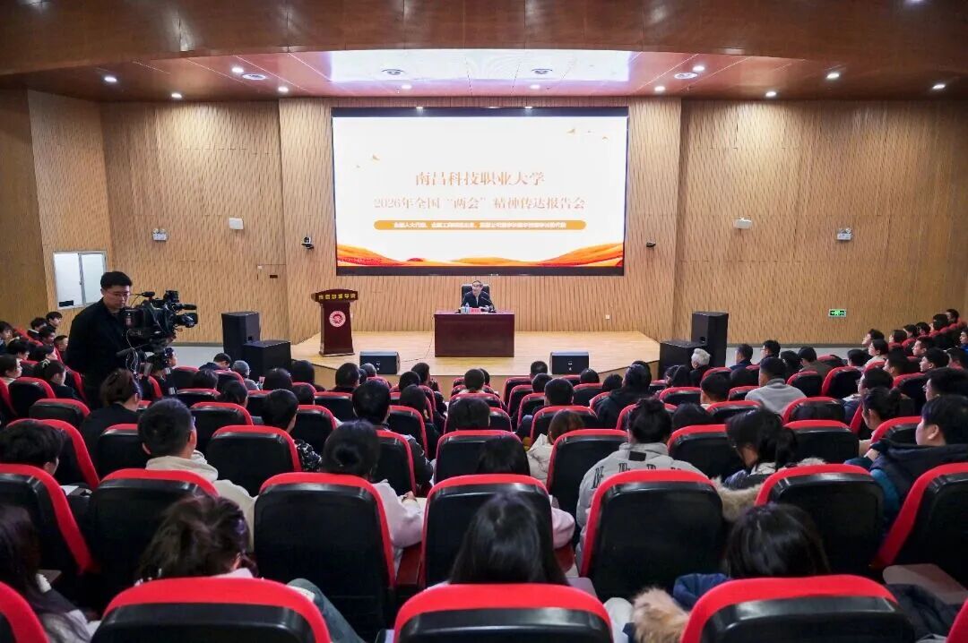 南昌科技职业大学举行2026年全国两会精神传达报告会。全国人大代表、泰豪集团董事会主席、学校理事长黄代放结合自身参会感受为全校师生代表传达全国两会精神。校长苏志武及学校中层以上干部、各基层组织员、党务干部、专职辅导员、学生党员代表、入党积