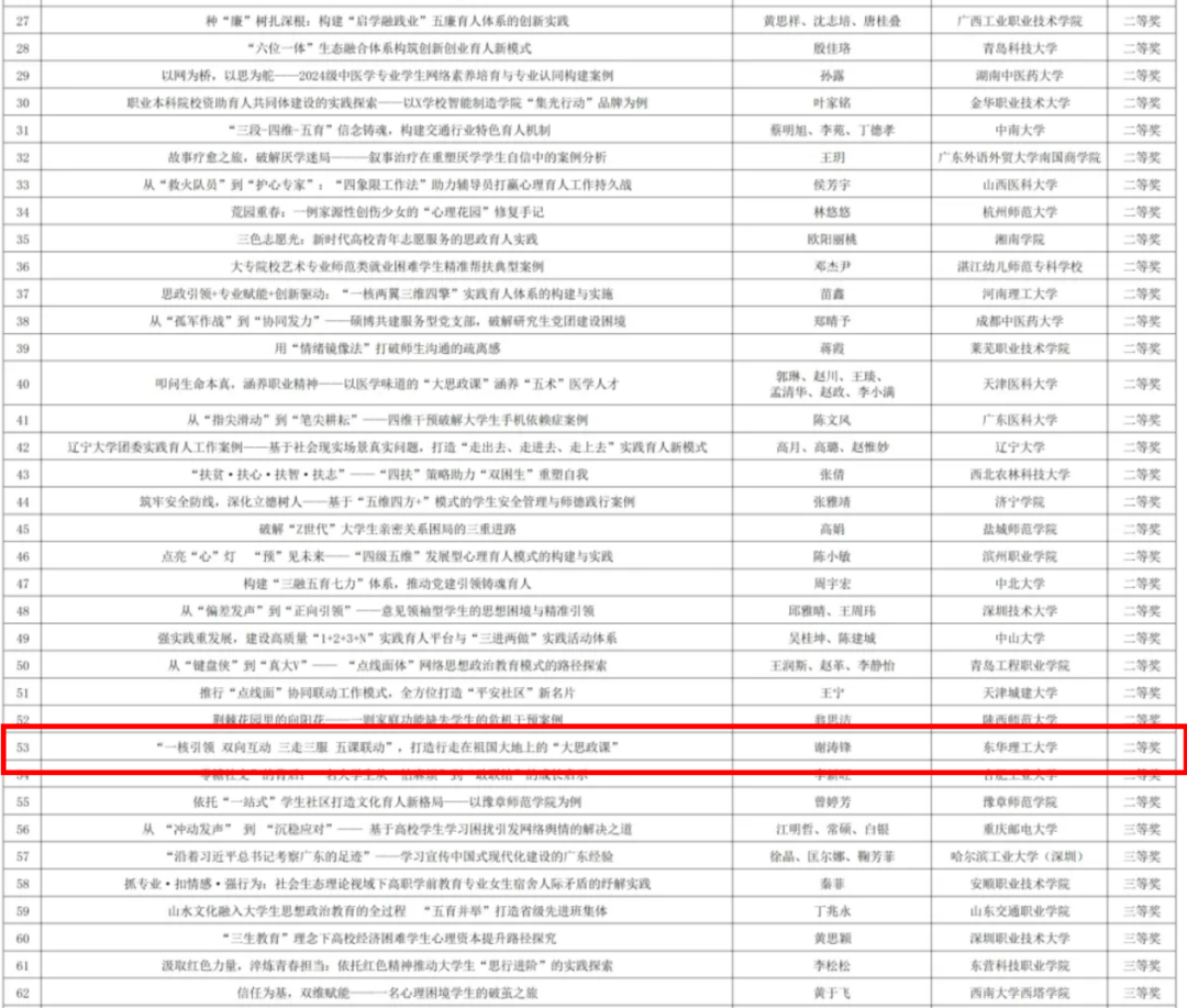 近日,教育部高校思想政治工作队伍培训研修中心(西安交通大学)公布了2025年度全国高校学生思想政治工作优秀论文与优秀案例征集活动的评选结果。东华理工大学地球与行星科学学院专职辅导员谢涛锋提交的工作案例《“一核引领 双向互动 三走三服 五课