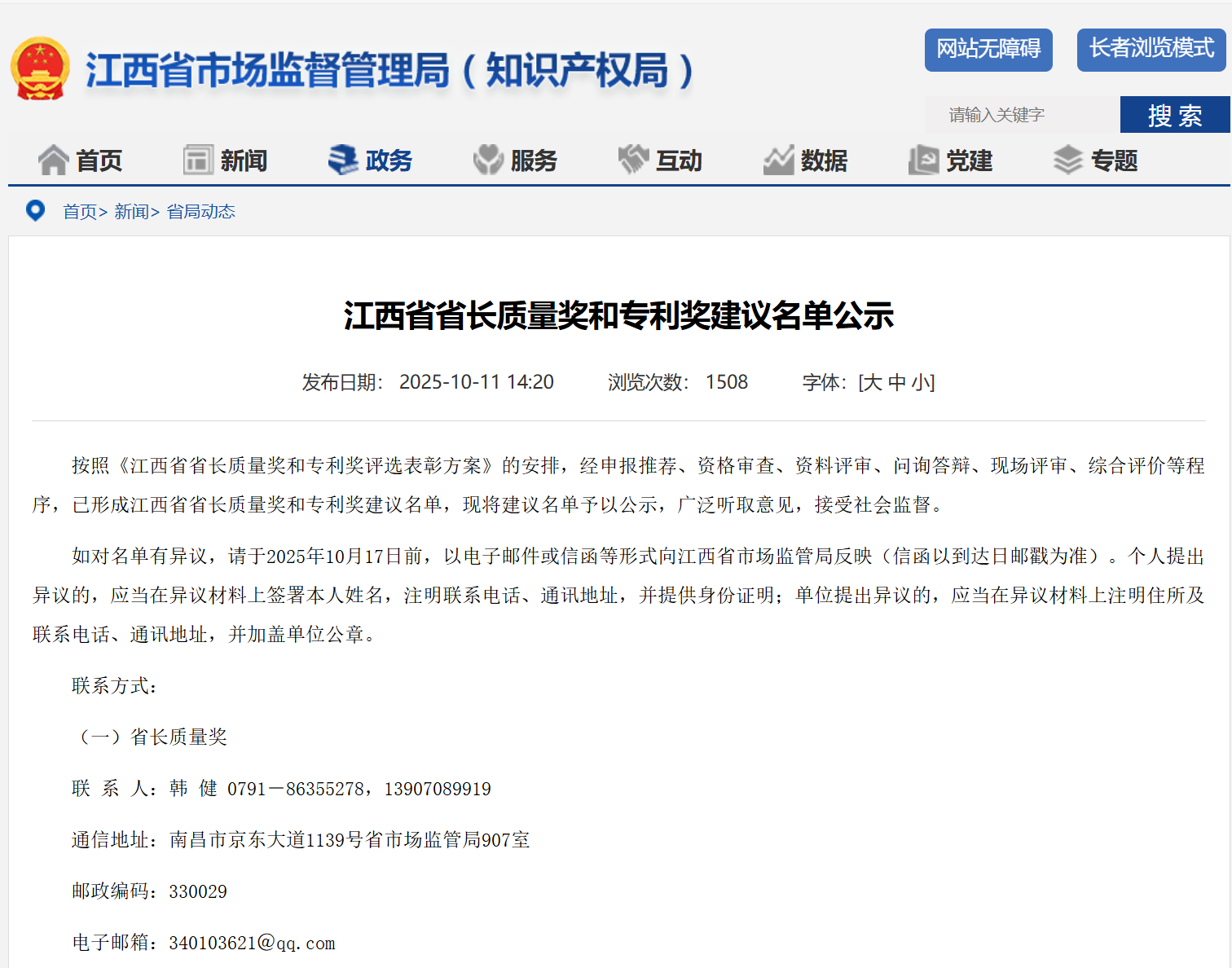 祝贺我会多家会员单位获评江西省省长质量奖和专利奖
