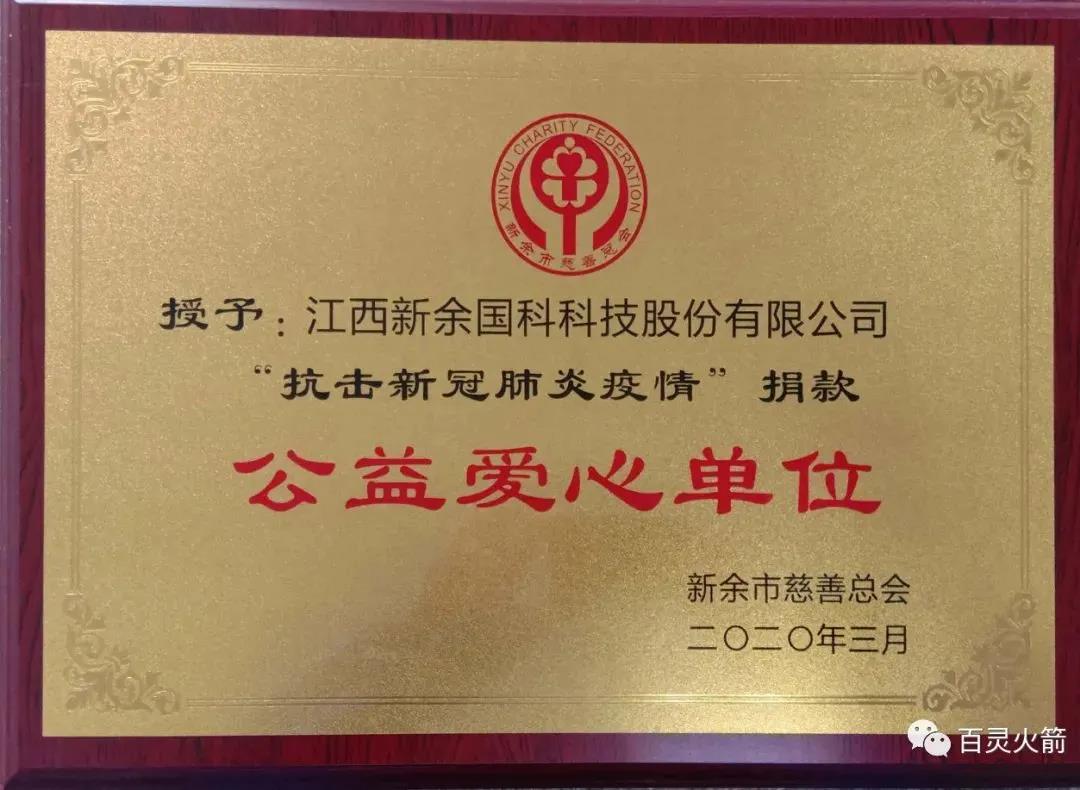 新余市慈善总会授予新余国科“抗击新冠肺炎疫情”捐款公益爱心单位荣誉称号