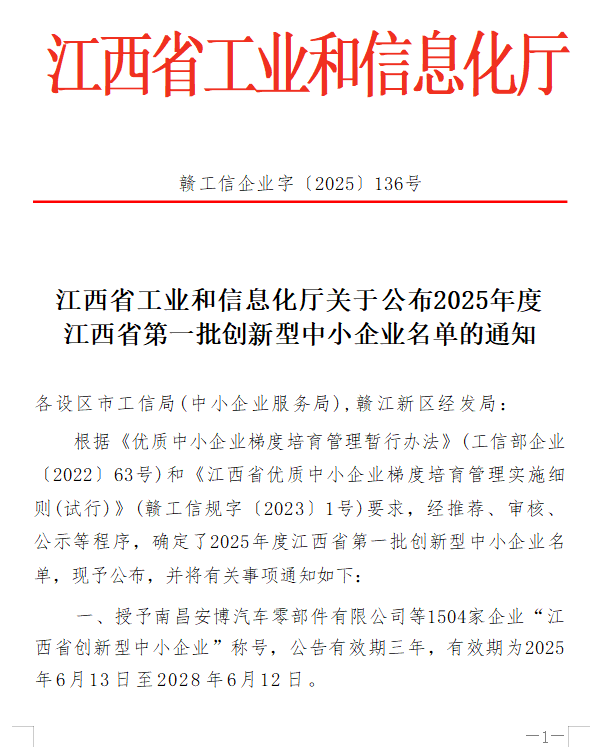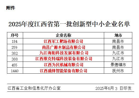 近日,江西省工业和信息化厅公布了《2025年度江西省第一批创新型中小企业名单》,我会为民机械、维克特瑞、军工靶场等六家会员单位榜上有名!