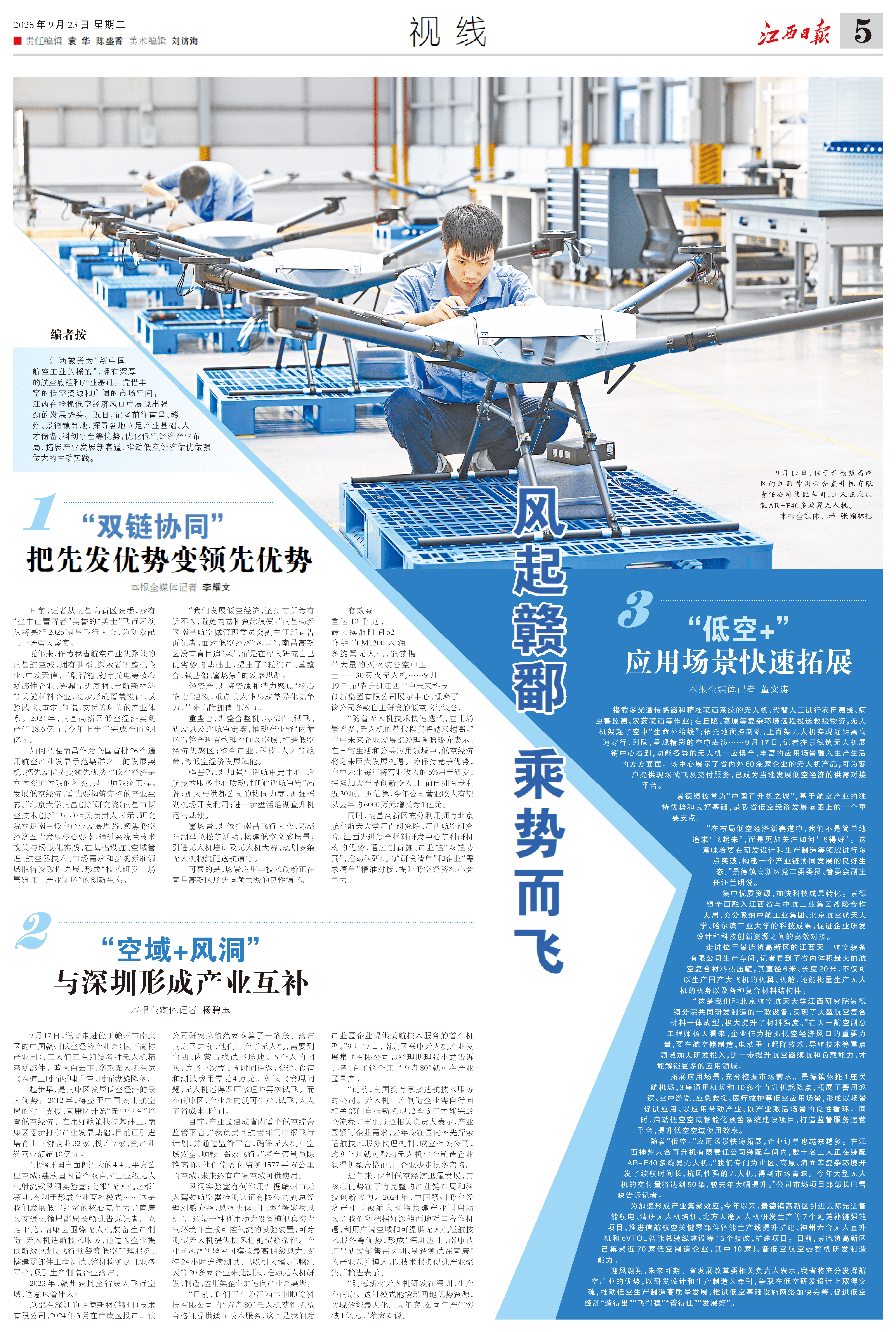 “在布局低空经济新赛道中,我们不是简单地追求‘飞起来’,而是更加关注如何‘飞得好’。这意味着要在研发设计和生产制造等领域进行多点突破,构建一个产业链协同发展的良好生态。”景德镇高新区党工委委员、管委会副主任汪兰明说。