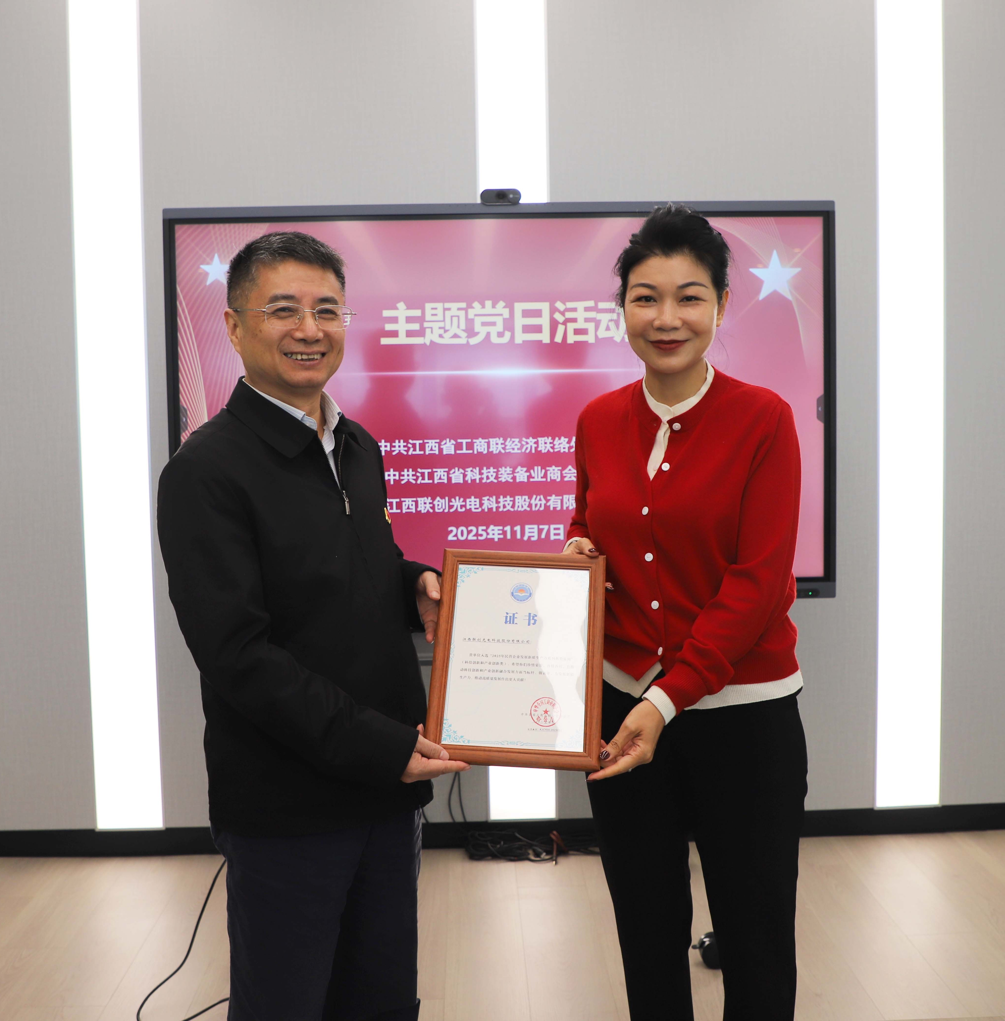 在全国上下深入学习宣传贯彻党的二十届四中全会之际,11月7日上午,省工商联经联处党支部与省科技装备业商会、联创光电公司党委联合开展以共促发展新质生产力为主题的党日活动,旨在表彰优秀民营企业科技创新成果,搭建政会企交流平台,引导全省民营经济高质量发展。